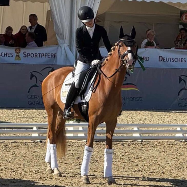 In der Klasse der vierjährigen Dressurpferde präsentierte sich Bon Bentley (Wallach v. Bon Coeur – Londontime) aus der Zucht von Heike Schulmerig und im Besitz des Dressurstalls Schulmerig mit einer Wertnote von 7,3 solide im Teilnehmerfeld. Unter der Reiterin Michele Schulmerig zeigte er ein harmonisches Bild und vielversprechende Ansätze für die Zukunft.