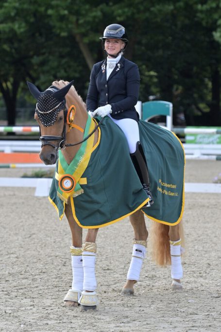 DSP Goldschatz (Wallach v. Genesis B – Dimension AT NRW), aus der Zucht von Heike Schulmerig und im Besitz von Dr. Anja Koban überzeugte unter dem Sattel von Michele Schulmerig bereits in der Einlaufprüfung für vierjährige Stuten und Wallache mit einem guten 5. Platz und verbesserte sich mit einer Wertnote von 8,4 auf den 2. Platz im Finale– ein herausragendes Ergebnis, welches die Qualität der regionalen Ponyzucht unterstreicht. Eine weitere Finalteilnehmerin aus Rheinland-Pfalz- Saar e.V. stellte Giulia Gasztecki vor, die 4- jährige Stute Georgia v. Genesis B x Dreidimensional AT aus der Zucht von Wolfgang Sautter.
