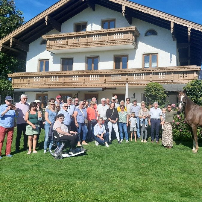 Am Sonntag stand die Rückreise an, in die als letzter Stop der Besuch eines sehr erfolgreichen bayrischen Züchters eingeplant war. Der Zuchtbetrieb der Familie Franz Galneder in Taufkirchen bei Mühldort a. Inn, vervollständigte die unterschiedlichsten Gestütsbesuche dieser Reise. Hier ein echter landwirtschaftlicher Musterbetrieb in Hand einer Großfamilie, die uns einen unglaublich herzlichen Empfang bereitete. Die Pferdezucht, dressurgeprägt, in der Hand des Franz sen. mit 12 Fohlen in diesem Jahr. Alle Fohlen werden hier aufgezogen. Die Ausbildung liegt seit 18 Jahren in der Hand der Bereiterin Kathi Drexler, ebenso die Vorbereitung der vorgesehenen Körkandidaten. Mit dem DSP-Siegerhengst von 2021 und weiteren gekörten DSP-Hengsten hat diese Zuchtstätte in den letzten Jahren große Erfolge gefeiert. Die gesamte Zucht geht auf eine 1991 als Fohlen erworbene Stute von Donnerhall x Pik Bube zurück. Sicher damals eine kluge Wahl. Heute gibt vorallem die Hengstlinie des Belissimo über seine Söhne Benicio und Bonds der Herde und den Jungpferden ein Gesicht. Der landwirtschaftliche Betrieb liegt in den Händen des Franz jun., der mit einer Biogas-anlage und ca. 200 ha Betriebsfläche bewirtschaftet wird und von dem Pferdebetrieb des Vaters mit ca. 80 Pferden rechtlich getrennt ist. Für die Nutzung der Gebäude und fürs Grünland zahlt Franz sen. an seinen Sohn Pacht und das betriebseigene Futter wird ebenfalls aus dem Betreib gekauft. Interresant war auch, dass das Heu für die Pferde mit der warmen Abluft, die in der Biogasanlage entsteht, nachgetrocknet wird. Dadurch wird das Wetterrisiko in Heuernte minimiert und eine Spitzenqualität des Heu´s erzielt. Der Einsatz von teurem Kraftfutter wird dadurch auf das nötigste beschränkt.